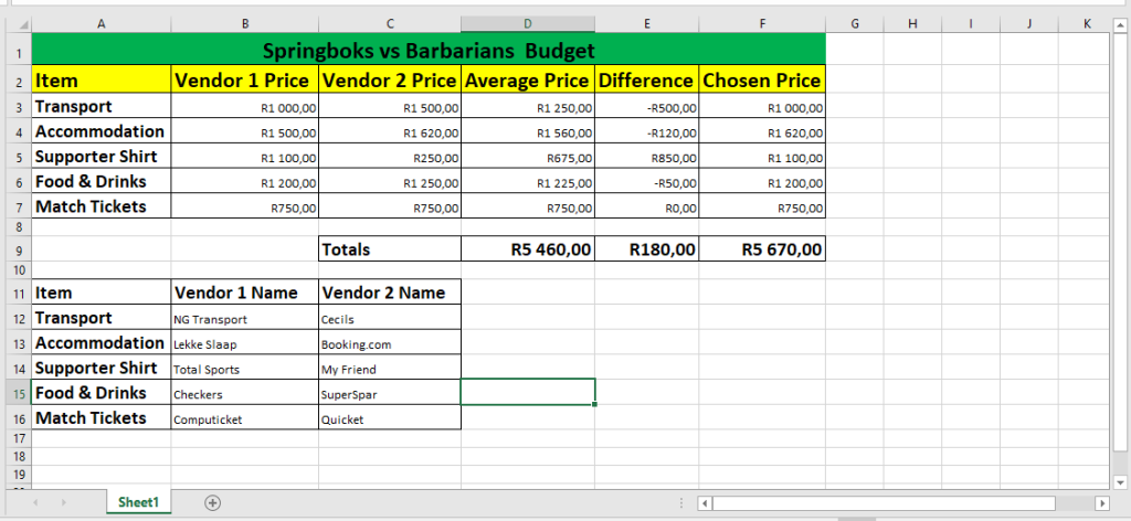 "Springboks vs Barbarians Budget"- Font: Size 20, Bold