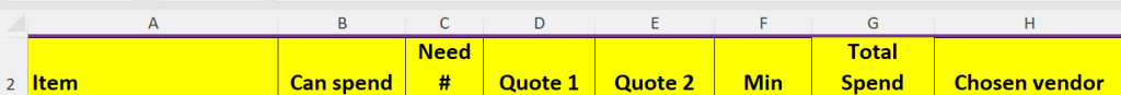• Complete the last column by entering your chosen vendor for each item in column H.