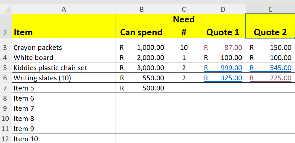 • In Columns D and E add the amounts that each item will cost from 2 different vendors