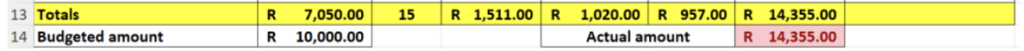 • In the row underneath the Totals cell (A13--> in A14) type Budgeted amount and in B14 put in your 10 000.