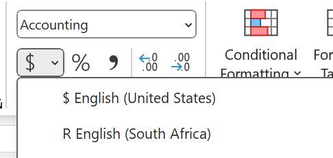 • Highlight B3 to G13 (last cell calculation) and change the numbers into Rands:
