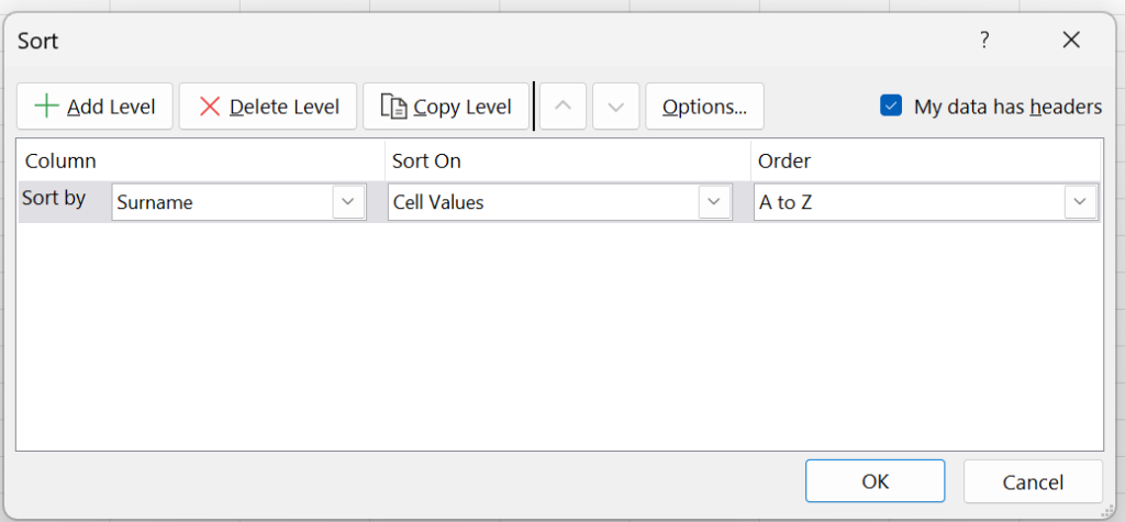 • Choose Sort by Surname --> cell values --> A to Z